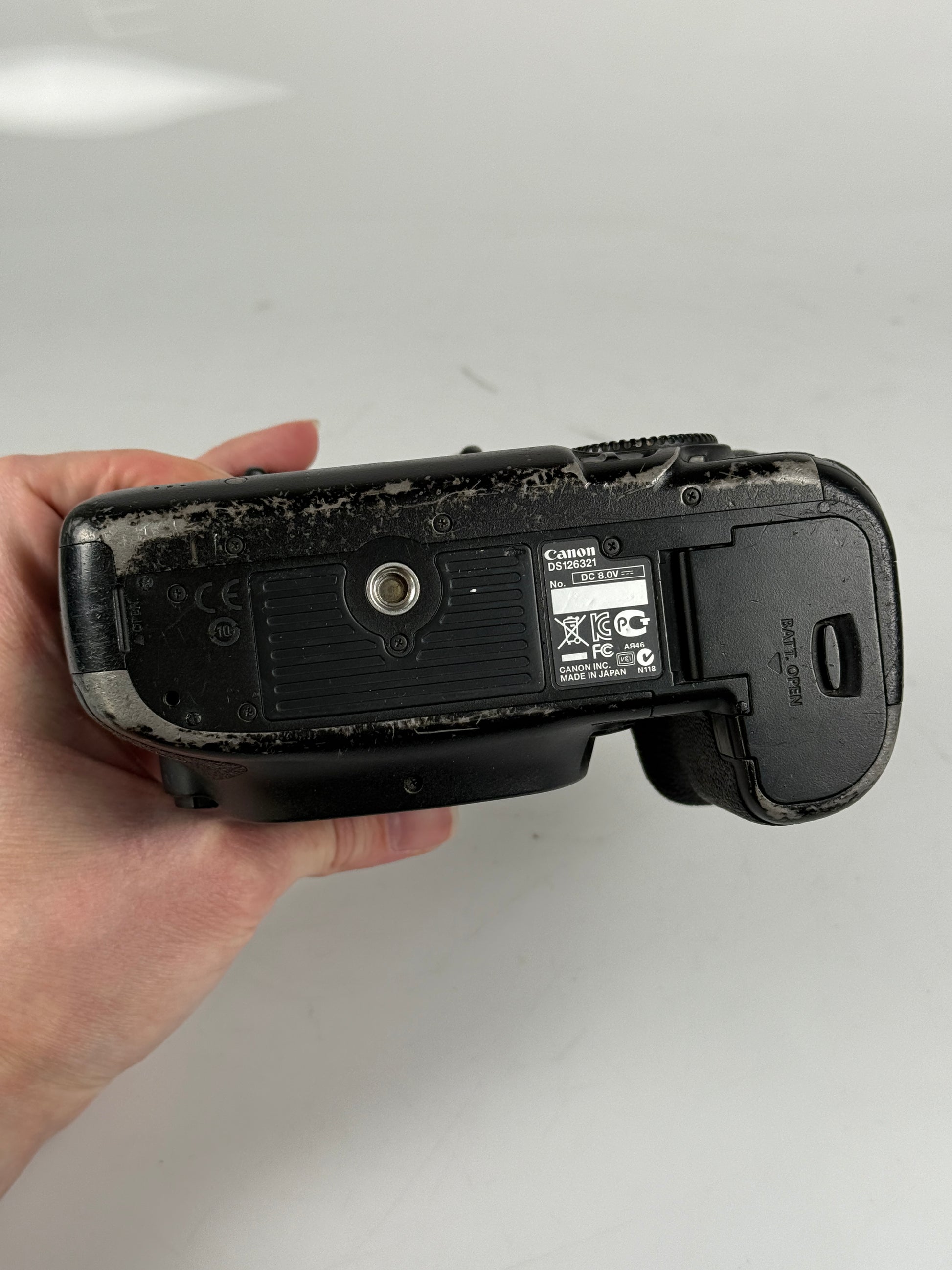 Camera is overall in user condition. Body shows wear and signs of use. Includes battery, no charger. Shutter count is 349k. Missing the dial.