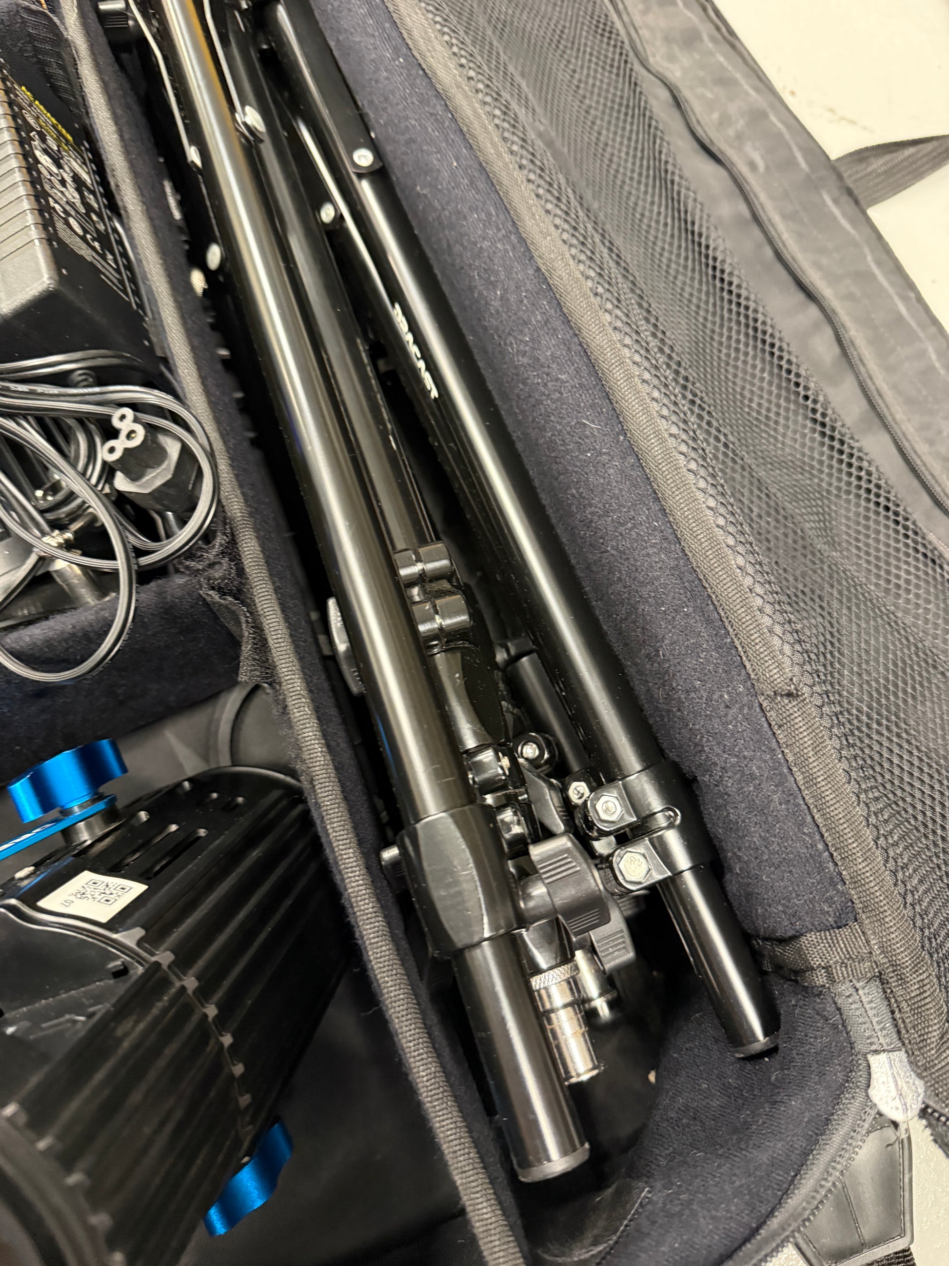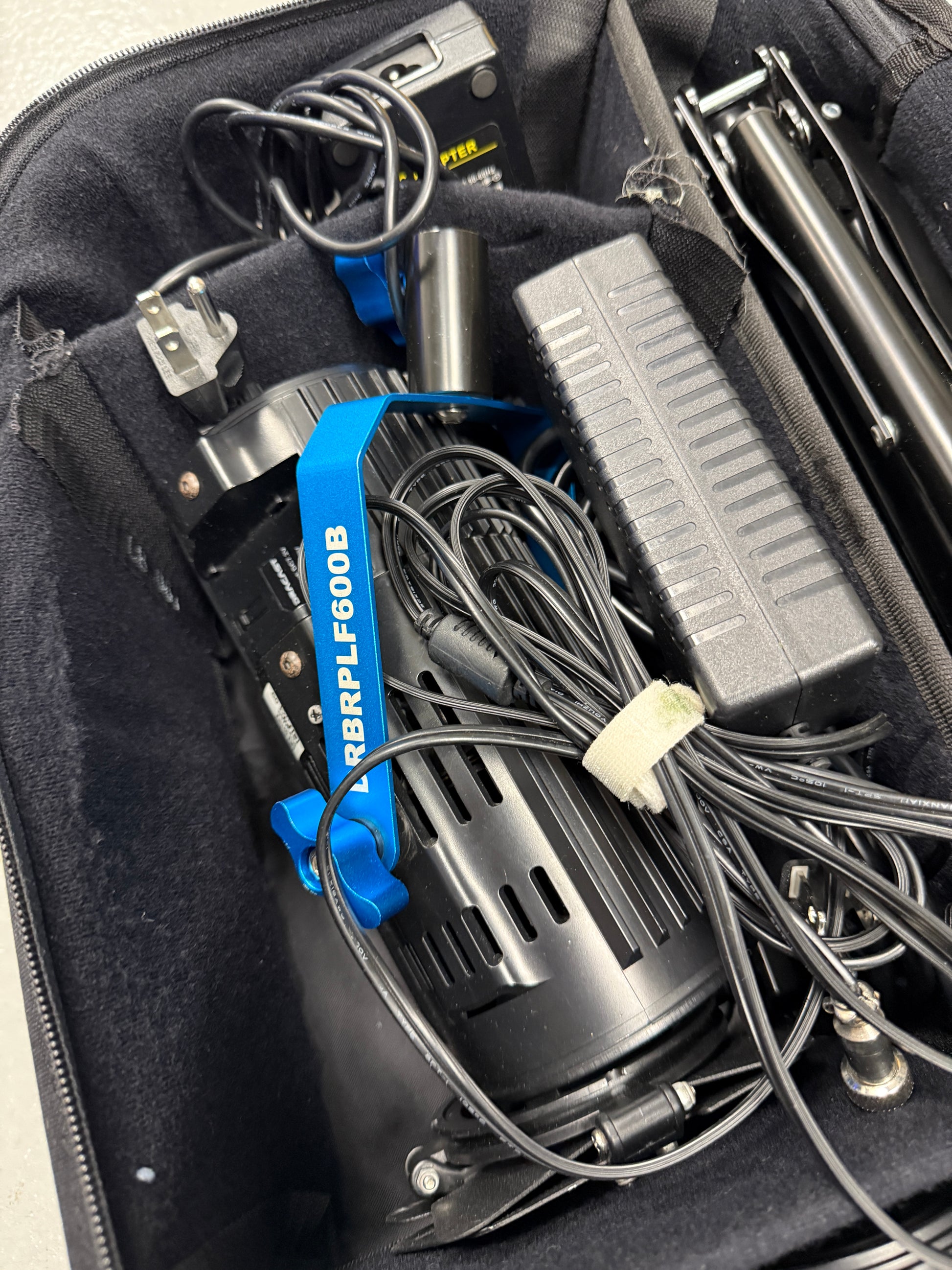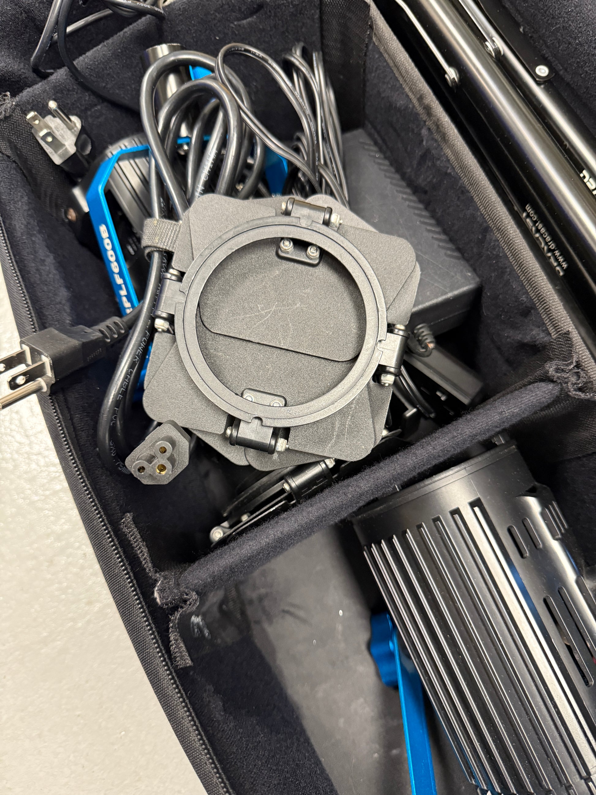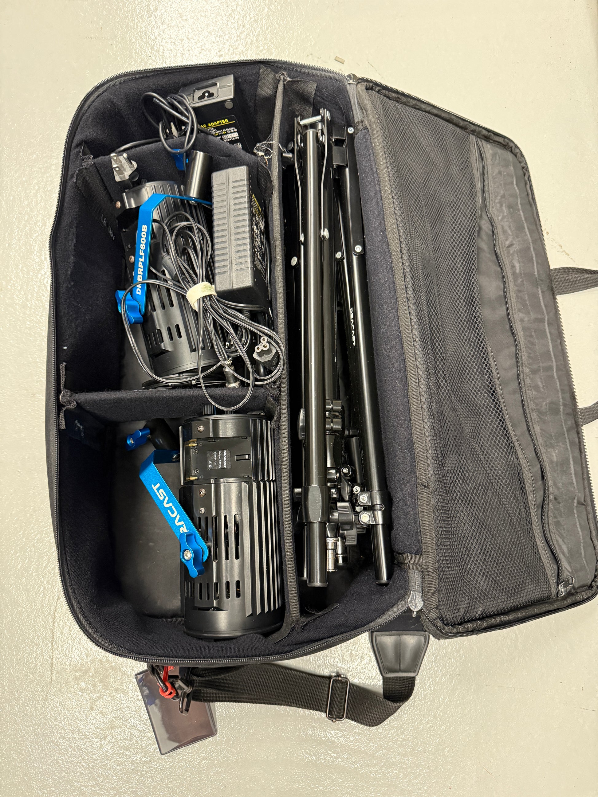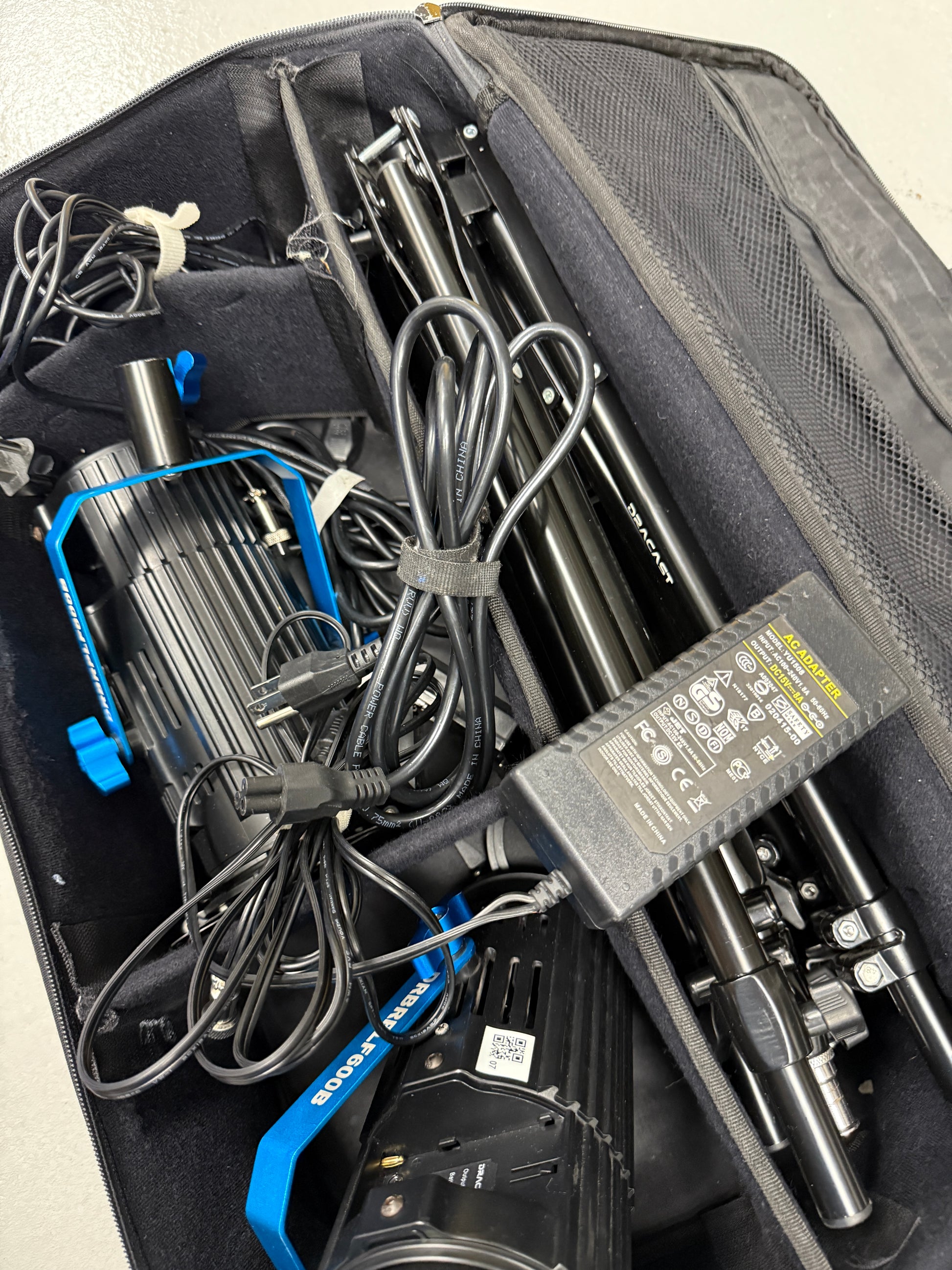 Very good condition and works perfectly. Comes with a case, 2 stands, 2 lights, power supply’s, and barn doors.