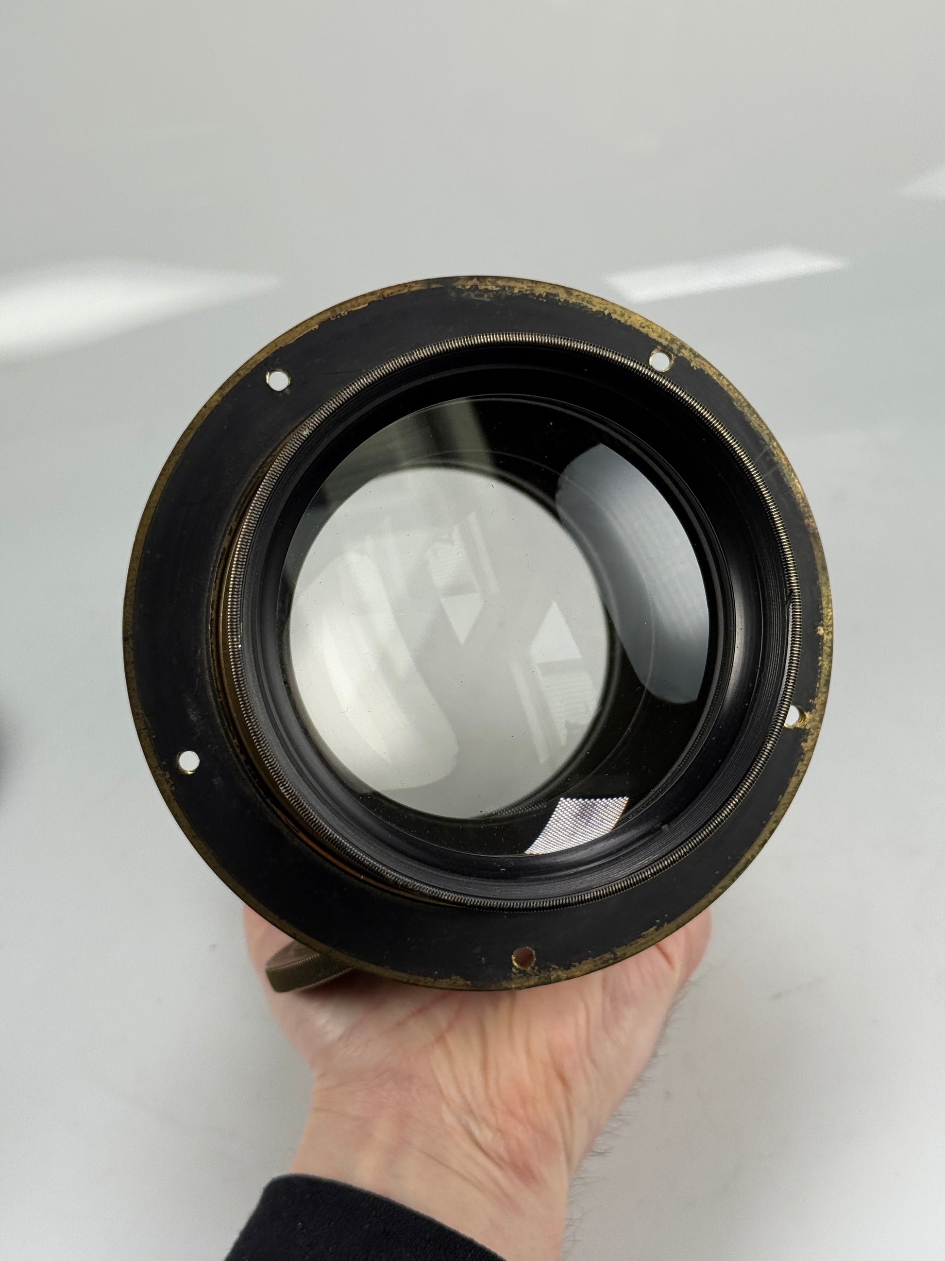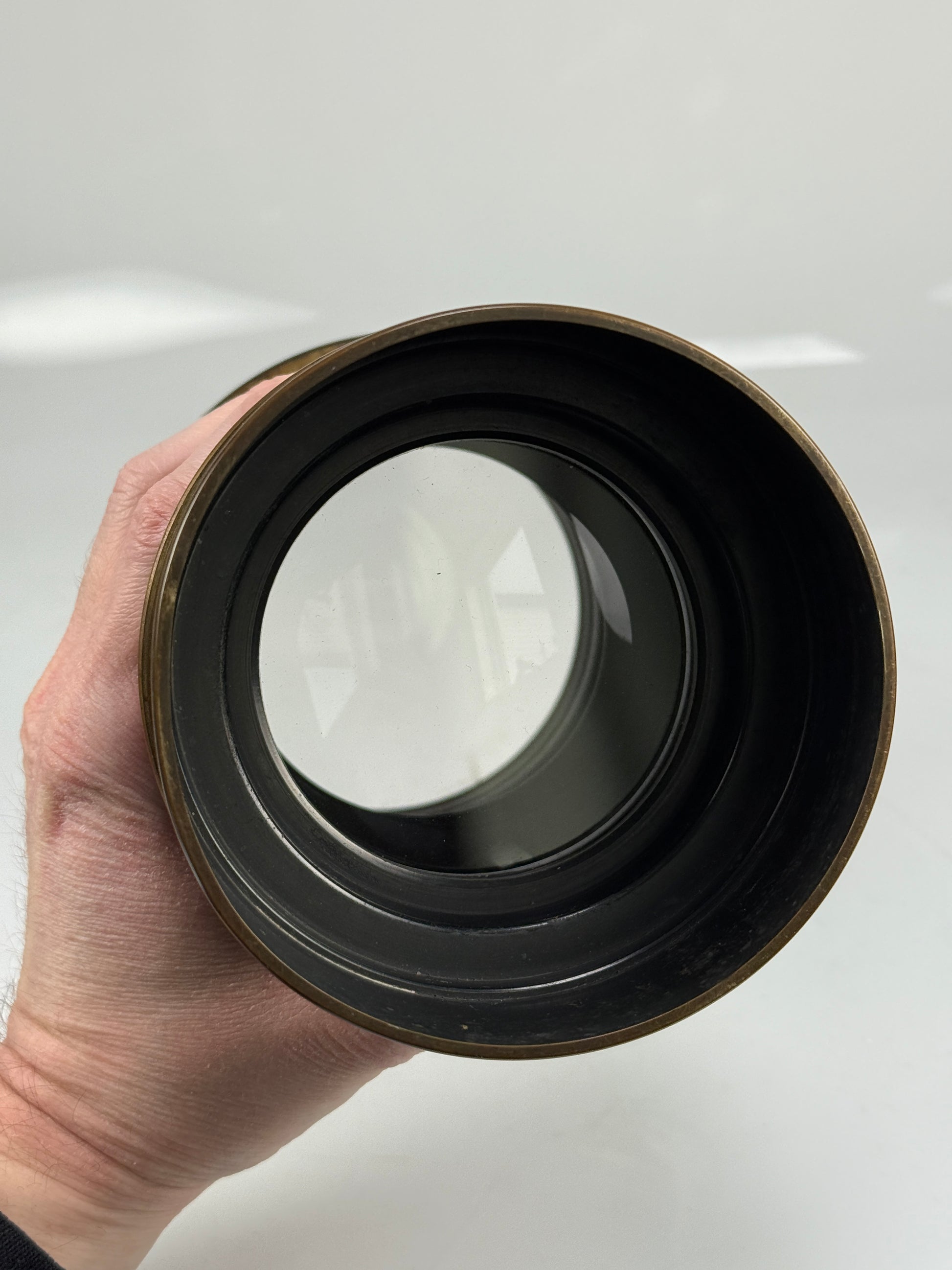 lens is in very good shape. Glass is excellent with no fungus or haze. The brass does show some wear but is overall nice. Very cool vintage lens. Has focus pinion and retaining ring. About 8 inches long with the hood and glass about 4 inches in diameter.