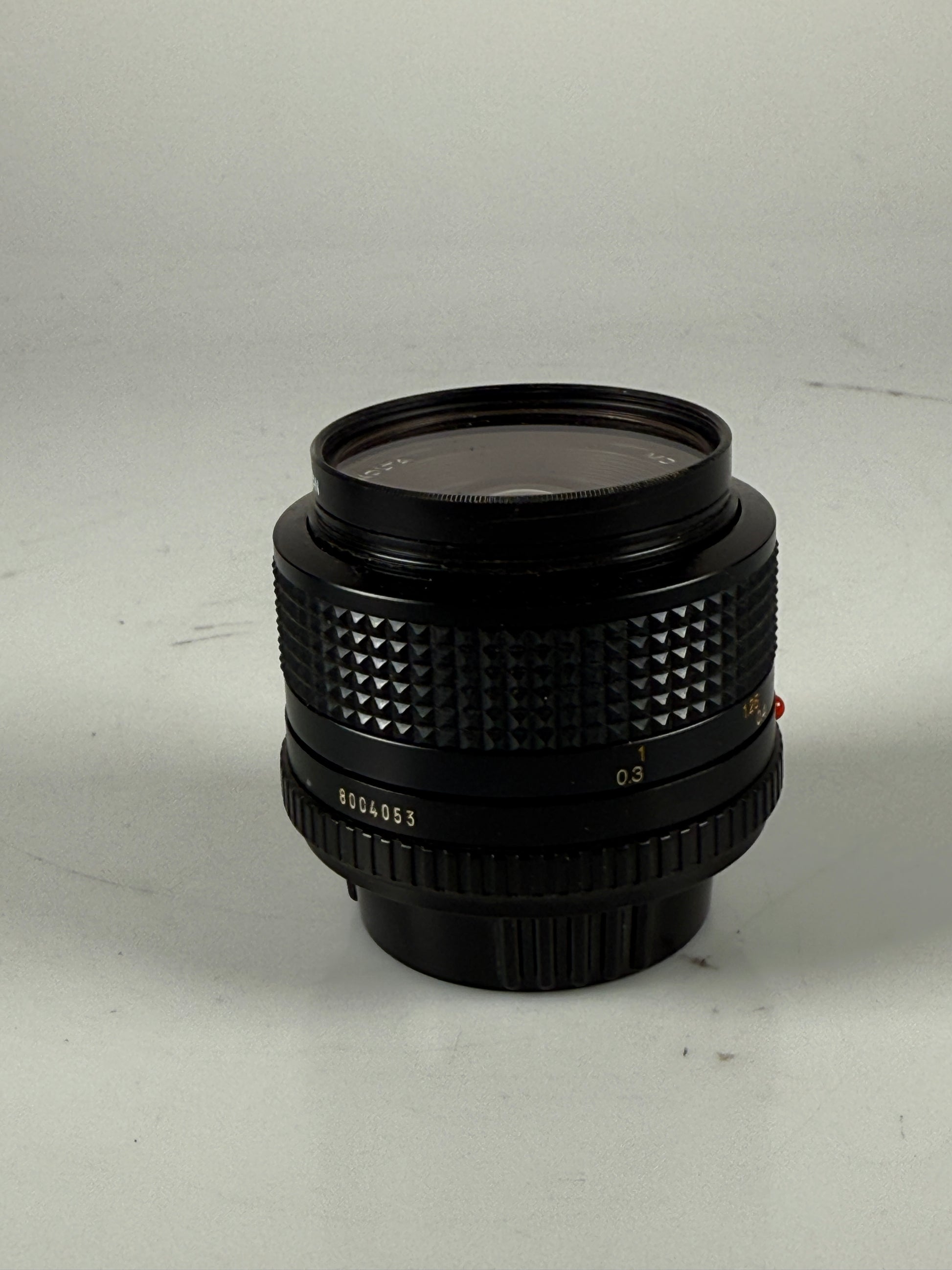 Lens is in very good condition. Glass is excellent with no fungus or haze. Focus is smooth. Aperture is nice with no oil. Comes with hood and caps.