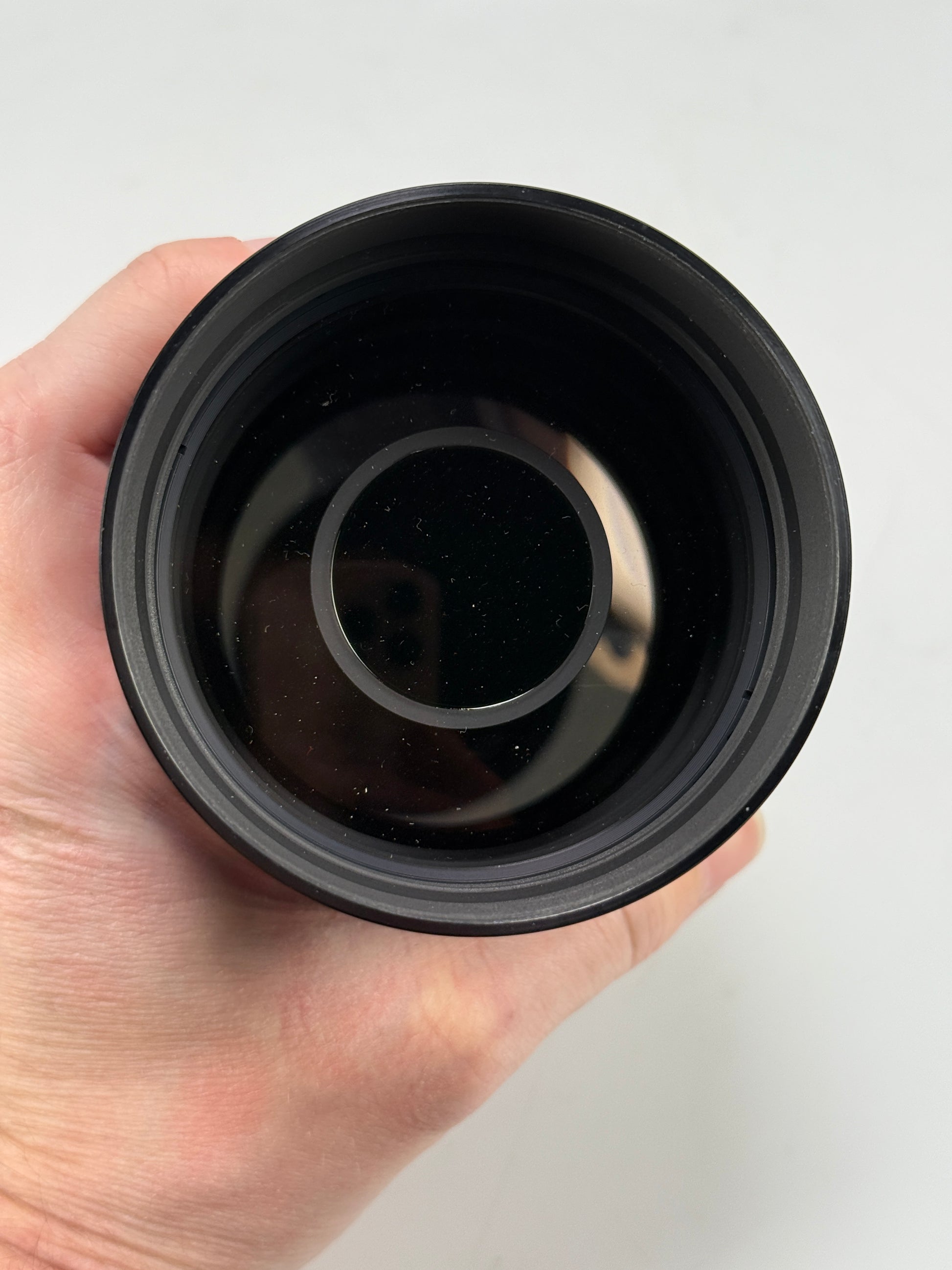Lens is in excellent cosmetic condition. Glass has no haze but there is small spots of fungus on the mirror internally. Focus is smooth. Aperture is nice with no oil. Very cool lens.