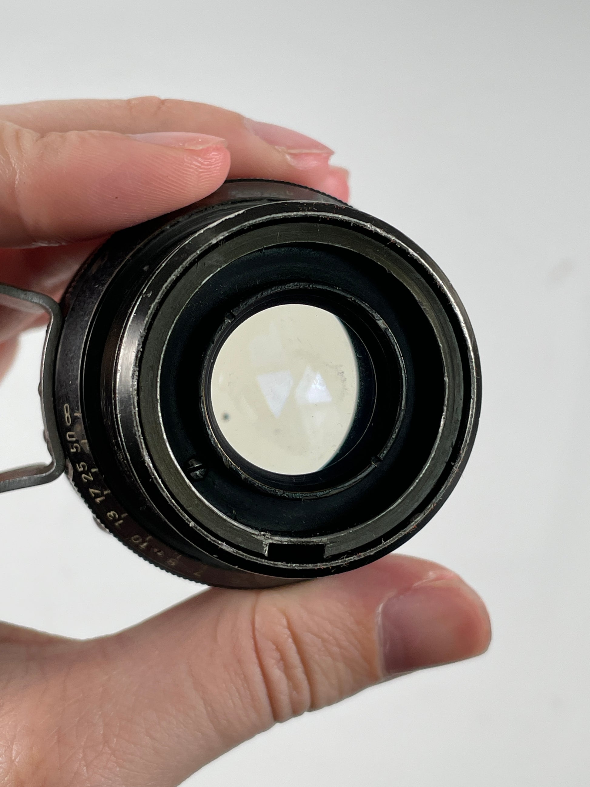Lens is in overall good cosmetic condition. Glass does have haze and some cleaning marks. Focus works well.